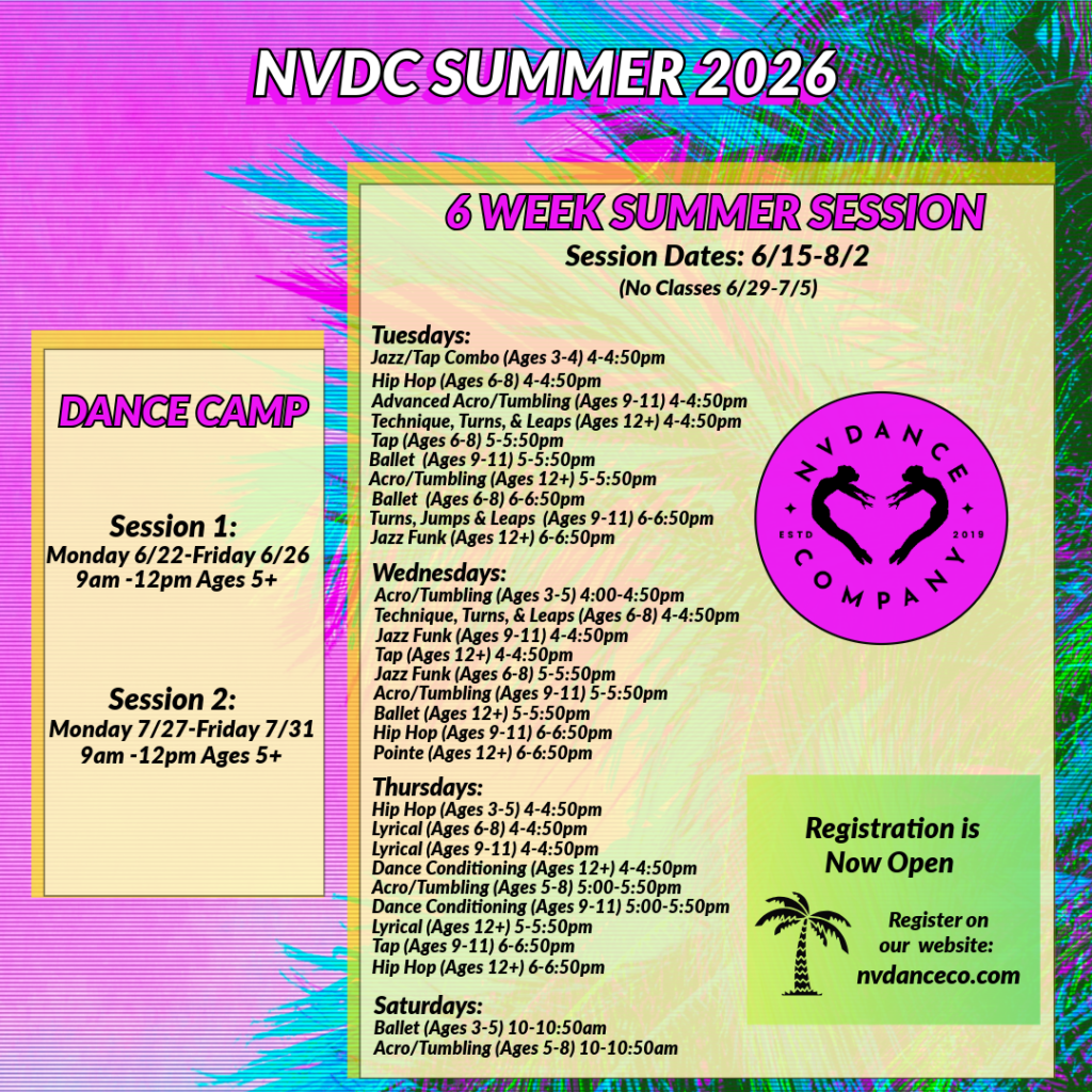 Enrollment for new NVDC Families opens on 8/15/25. Current families can see their dancer’s class schedule for next year by logging into their parent portal.